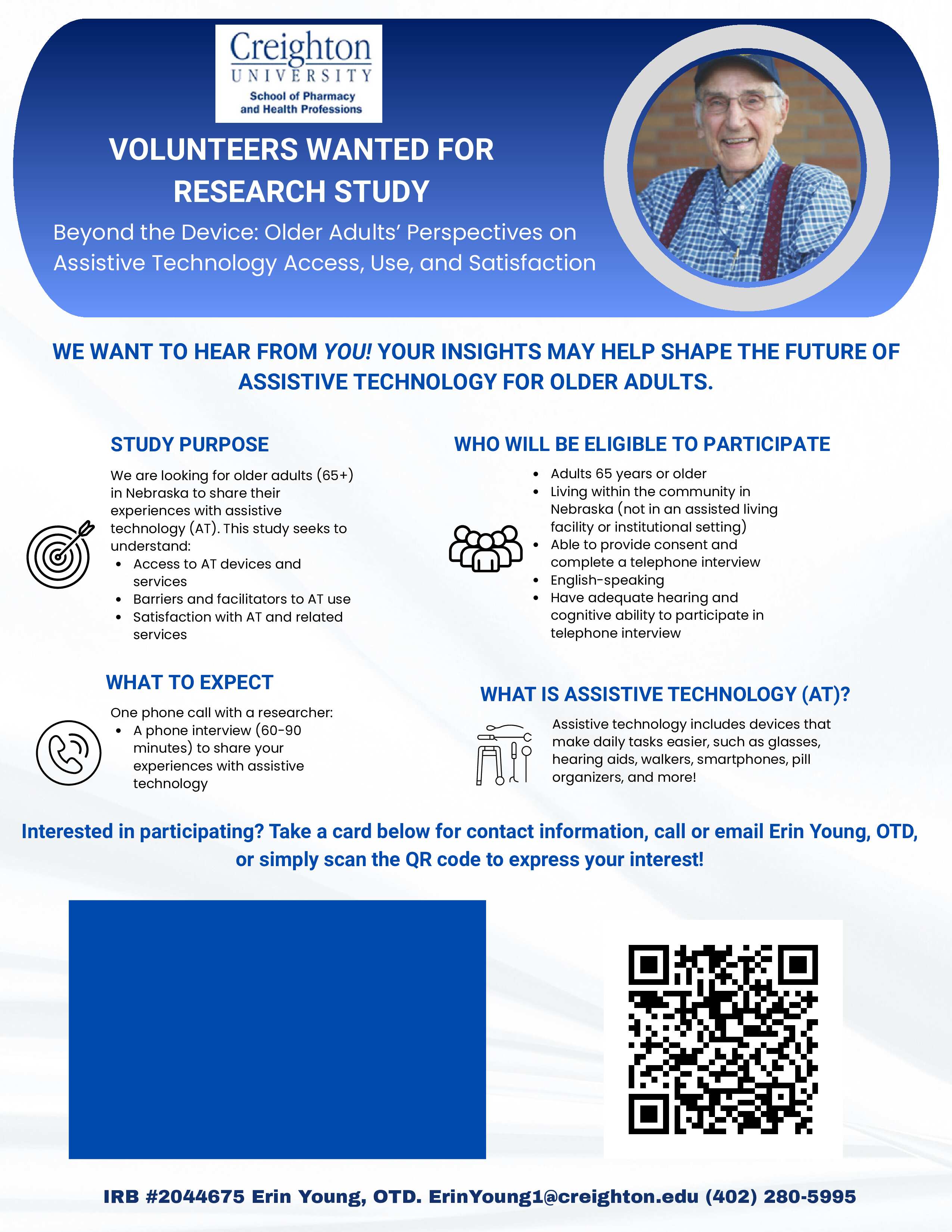 Research StudiesHow to AdvertiseIf you attend an OT school in Nebraska, we ask that all members of the research team be current NOTA members and we will post your study for FREE. This will include the information on this research study web page, one Facebook post, and it will be listed in our monthly email that is sent to our NOTA Members on/around the 1st of each month. Please contact the NOTA Administrative Assistant at [email protected] for assistance with this process. If you are outside of Nebraska, you may advertise your research study on this research study web page, one Facebook post, and have the information listed in our monthly email that is sent to our NOTA Members on/around the 1st of each month. The cost for this type of advertisement is $30 per month. Click here to advertise!